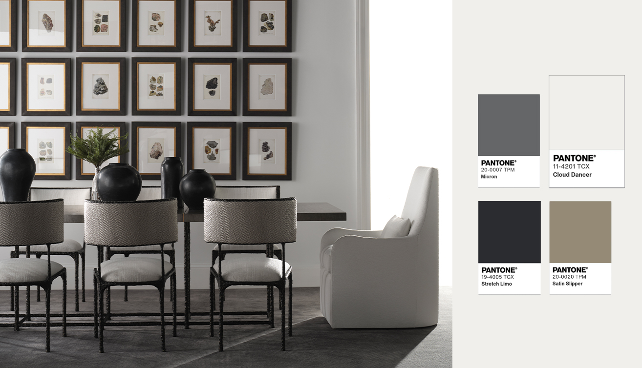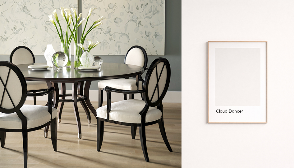 在這個餐敘空間中,雲舞白 Cloud Dancer 為空間鋪陳安定基調,讓比例與材質被清楚看見,為整體增添成熟而迷人的張力。