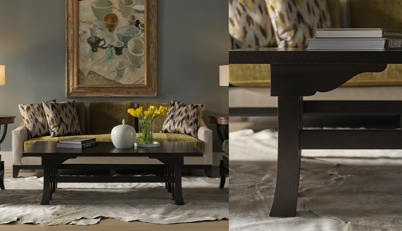 Pagoda Cocktail Table 以東方建築為靈感,胡桃木飾面刻畫層層堆疊的檯面比例,線條簡潔而平衡,使其能自在穿梭於現代、東方混搭或靜奢風格的空間。