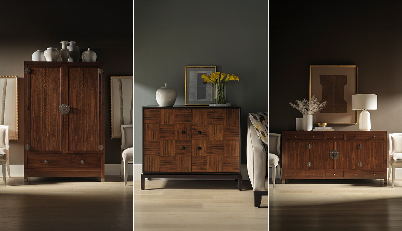 Low Cabinet 與 Ming Sideboard、Ming Cabinet 則展現了對「現代生活尺度」的理解。Low Cabinet 透過烏木飾面與霧黑古銅金屬配件,讓矮櫃在視覺上維持低調,卻在材質對比中保有奢華氣度,可以做為日常收納使用,也適合用在畫作之下搭配展示。Ming Sideboard 與 Ming Cabinet 延續 Milling Road Original 的東方建築語彙,胡桃木結構搭配可調層板與經典鑰匙孔式五金,既具收納機能,也為空間引入內斂而有層次的東方神韻。