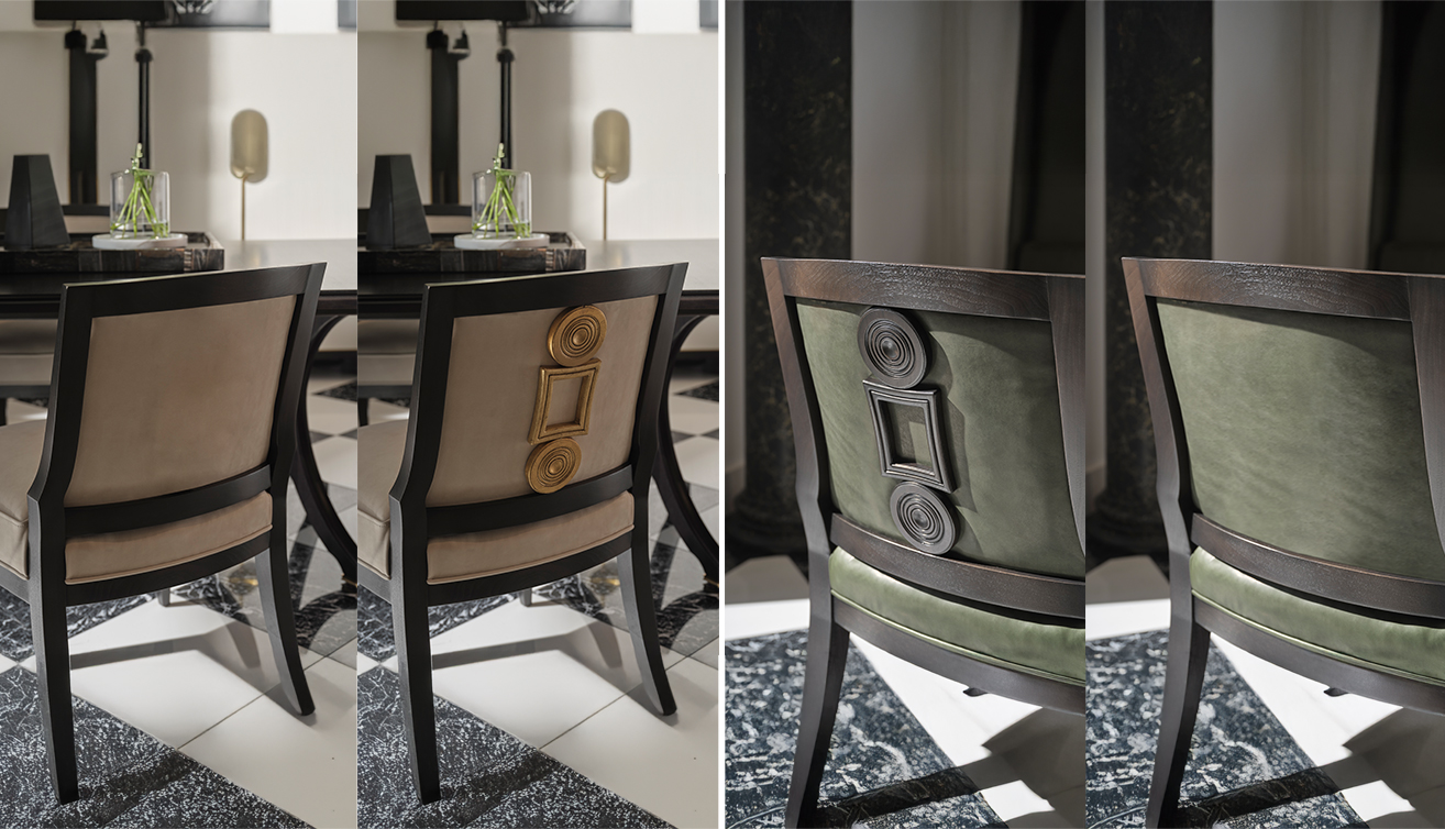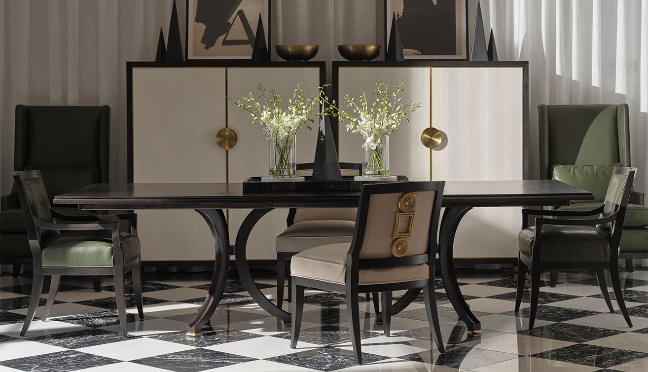 雕塑語彙當代設計師 Laura Kirar 推出的 Vienna Dining Table 與 Vienna Side Chair、Vienna Arm Chair 則更具藝術感。餐桌以長方桌面結合雕塑感桌腳,胡桃木搭配拋光古銅金屬細節,並附延伸桌板,提高宴客時的彈性;單椅則從層疊珠寶汲取靈感,椅背如畫框般勾勒出柔和線條,為餐空間帶來近似珠寶盒般的細膩光影。