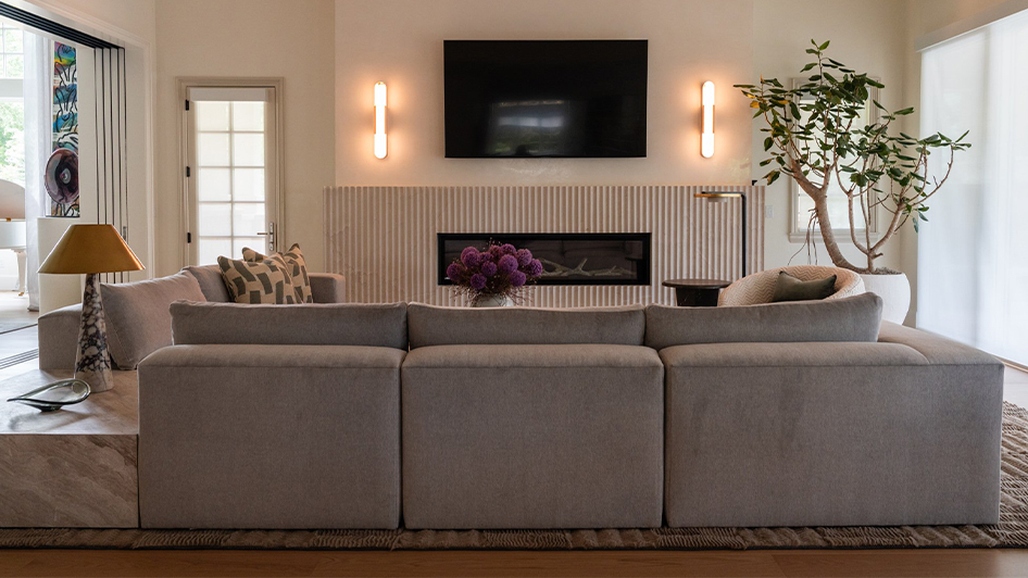 這處兼具視聽機能的客廳空間,以沉穩色調與柔和光線營造放鬆而專注的氛圍。低背沙發圍塑出內斂的觀看尺度,使視線自然聚焦於壁爐與螢幕,同時保留充足的空間呼吸感。材質運用回歸簡潔,織品、石材與植栽彼此平衡,讓觀看、休息與靜坐都能在不被打擾的節奏中進行。