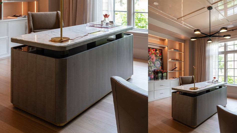書房以溫潤木質、柔和光線與俐落線條構成安靜而專注的工作場域。窗邊自然光引入日間節奏,搭配間接照明與收納牆面,使閱讀、書寫與思考都能在穩定的氛圍中進行。透過材質層次與比例安排,書房成為日常中最能沉澱心緒的一隅。