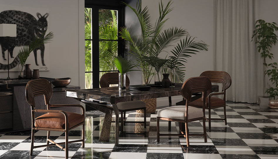 黑白棋盤格地坪強化空間節奏,與窗外綠意形成鮮明對比。自然光線穿透大面窗景,使木質與石材紋理更顯深度。整體氛圍沉穩中帶有生機,營造出適合聚餐與交流的優雅場域。