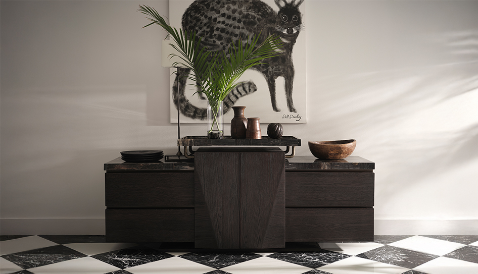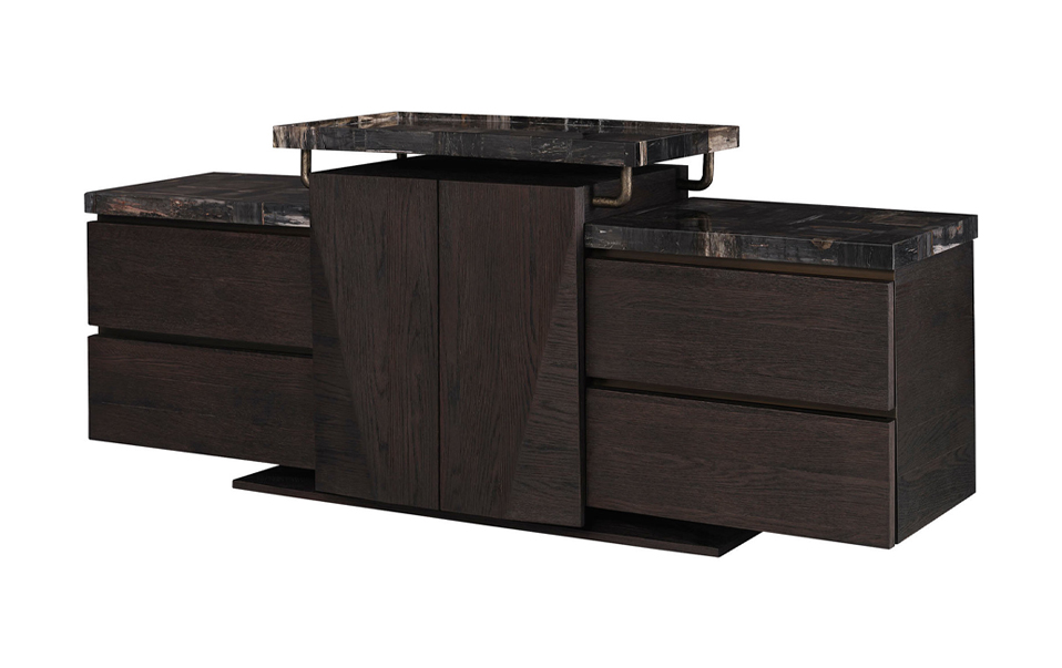 收納區域以深色橡木打造,低矮厚實的比例展現沉穩氣質。石材檯面延伸自然紋理,與木質立面形成層次對比,中央切角線條使結構更顯俐落。