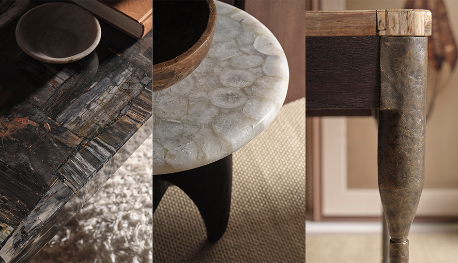 從桌几、座椅到裝飾單品,該系列展現了豐富且有機的質地:黑棕色木化石釋放出古老的力量感;晶瑩的水晶白瑪瑙讓人聯想起雨林瀑布;噴砂橡木則揭示了自然紋理之美。
