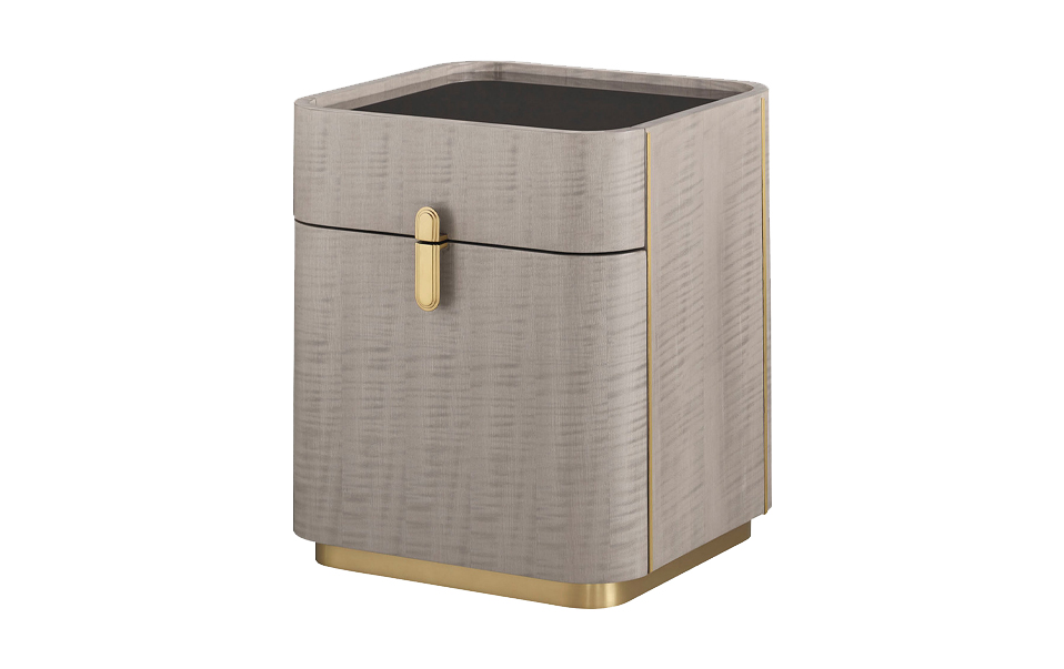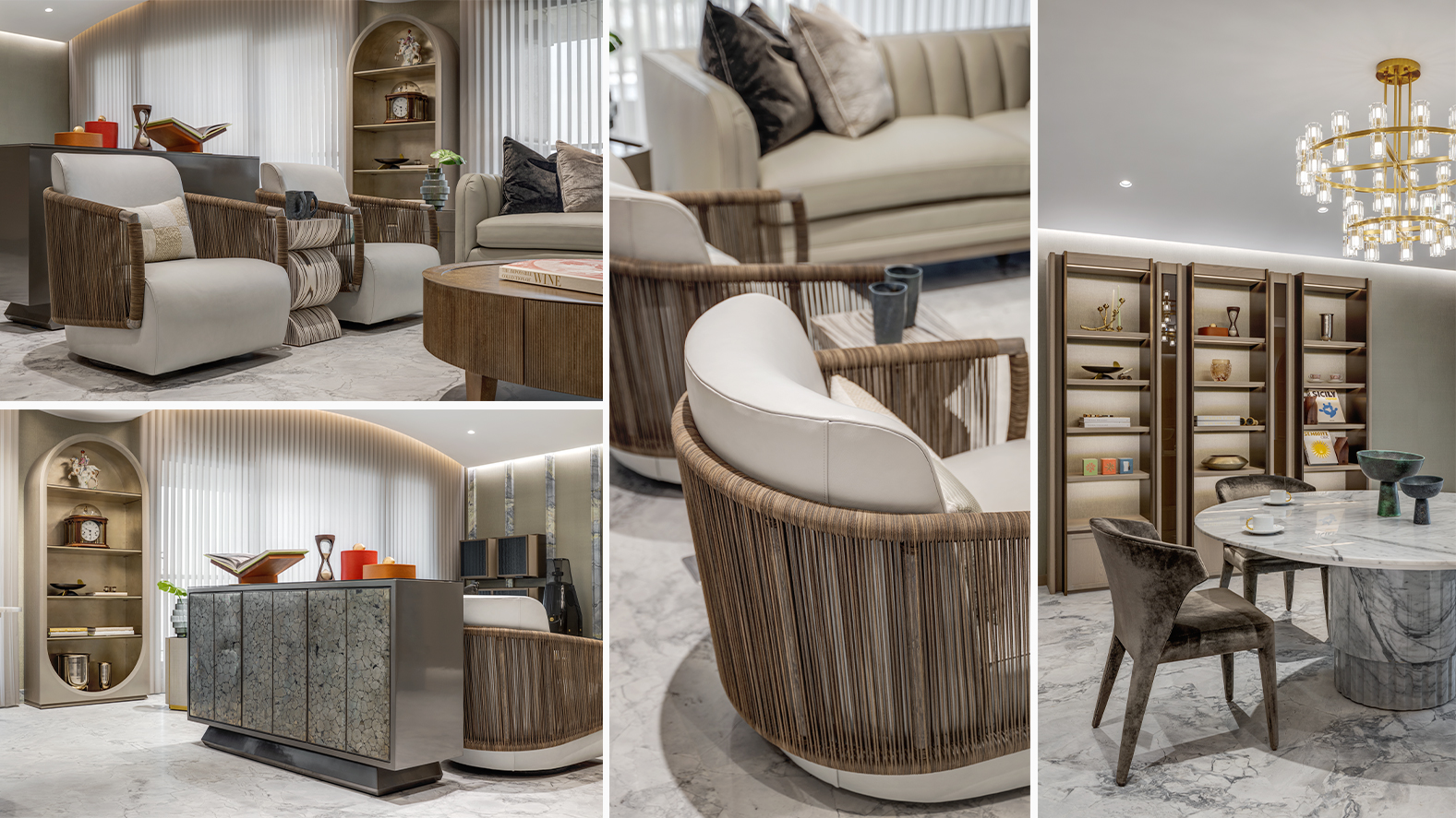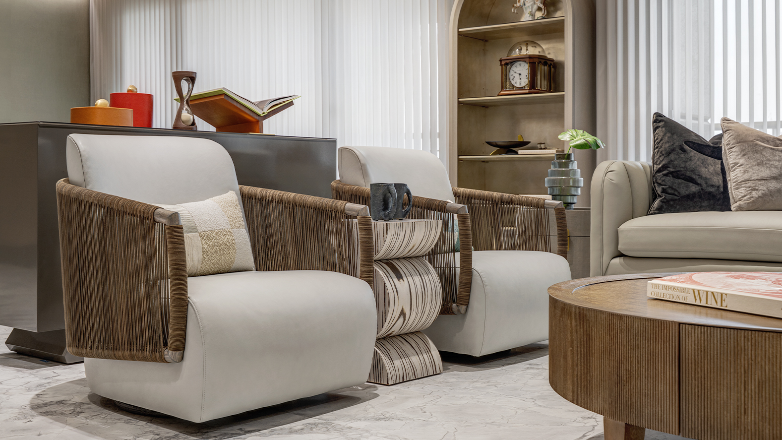 櫃體上的 ASSOULINE The Library Collection 生活物件,包括沙漏、書架與收納盒,以皮革、胡桃木、麂皮與拉絲金屬打造。這些細節讓閱讀與收藏自然融入空間,使客廳呈現沉穩而富有文化氣息的生活氛圍。