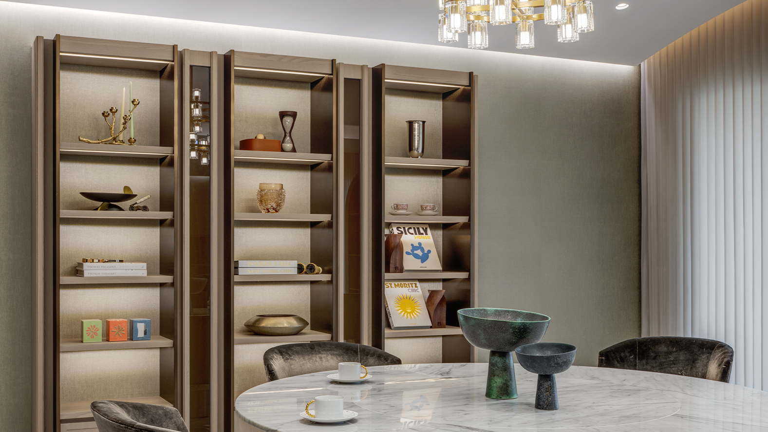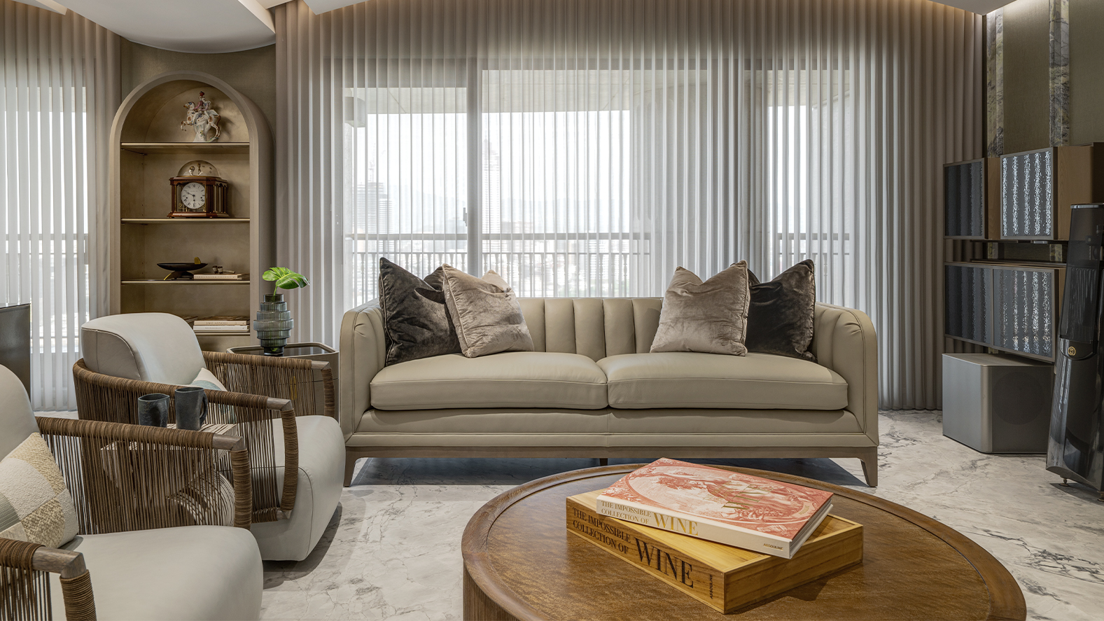 空間在家具、收藏與生活細節之間建立平衡,使城市高樓中的日常生活呈現出沉穩而優雅的節奏。