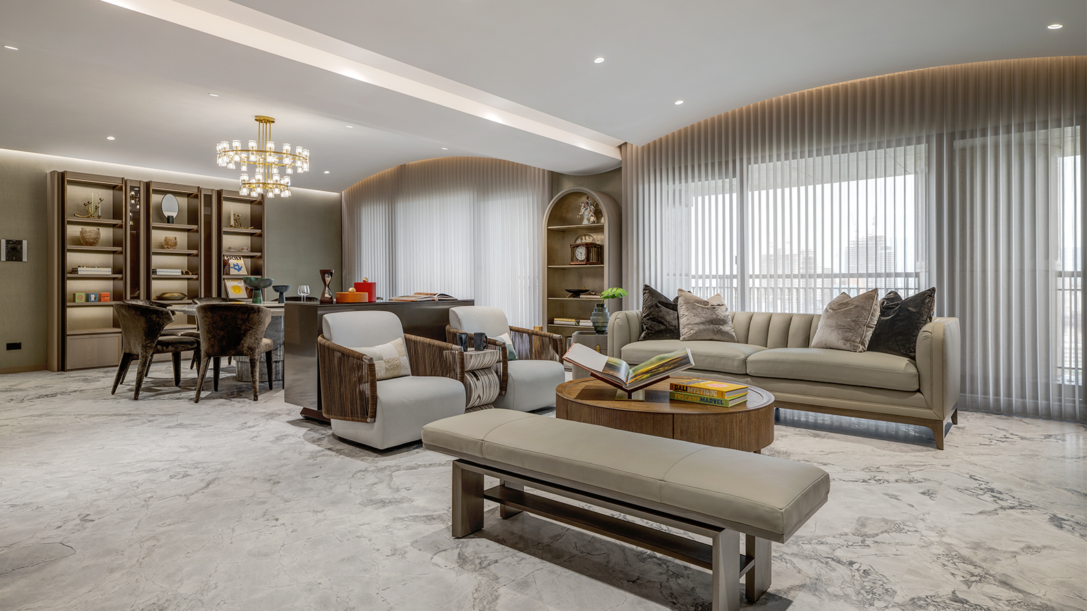 客廳整體空間中性色調,大面落地窗將城市景觀引入室內,使視覺更加開闊。家具配置以圓潤線條與自然材質為主,整體氛圍舒展而安定。