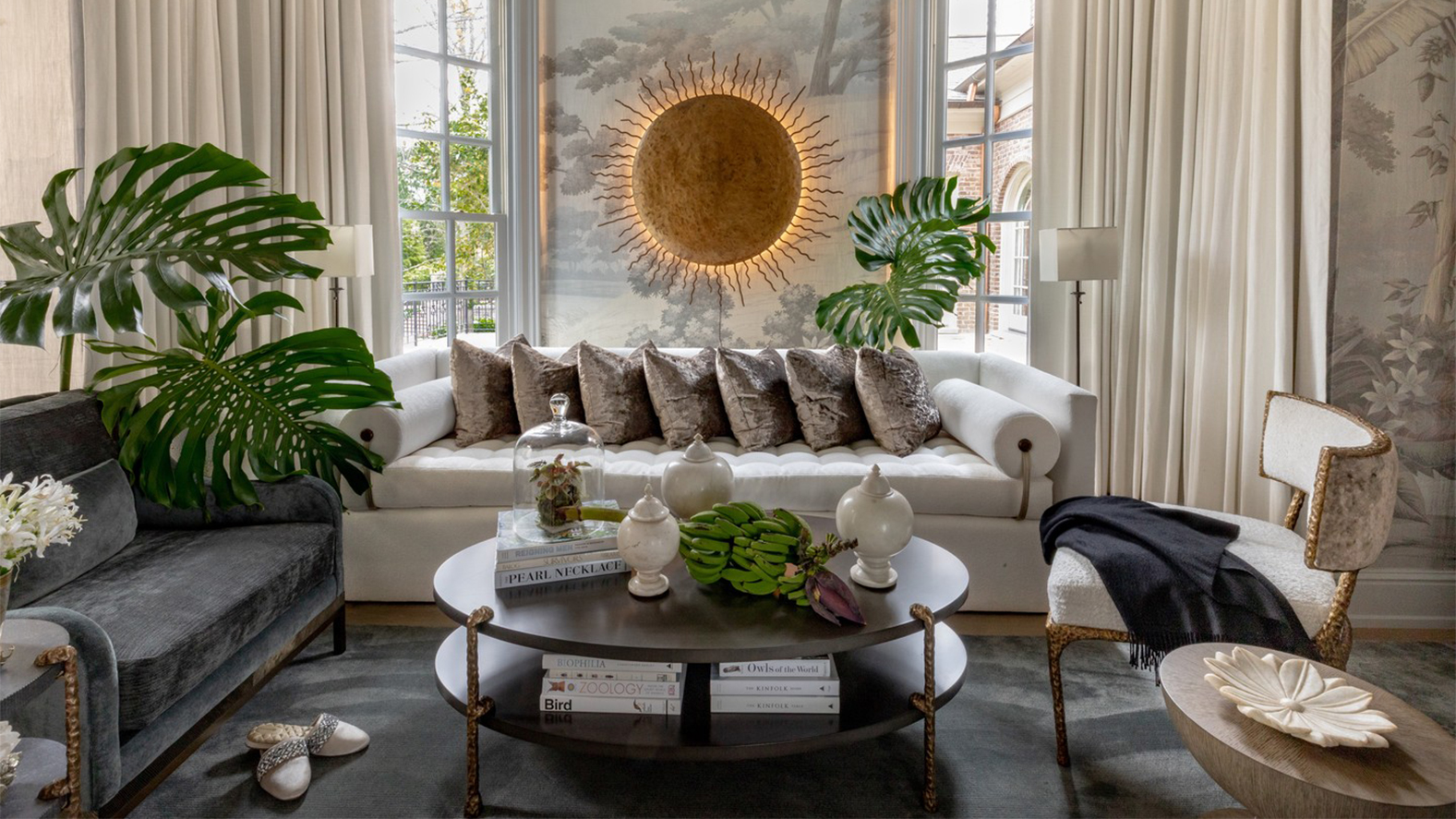 在 Nashville Showhouse 的客廳裡,柔軟窗簾與淺色沙發鋪陳出明亮而舒適的空間基調。中央那盞如火般綻放的圓形燈飾向四周散開金色光芒,成為整個空間的視覺核心,也讓人聯想到火山地貌所蘊藏的能量與張力。