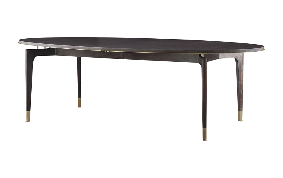 餐桌以近乎「懸浮」的姿態定義了空間。桃花心木與黃銅腳套的收束處理,成為開放場域中的穩定軸心,完美承接牆面巨大的當代畫作,形成時空場域的視覺對話。